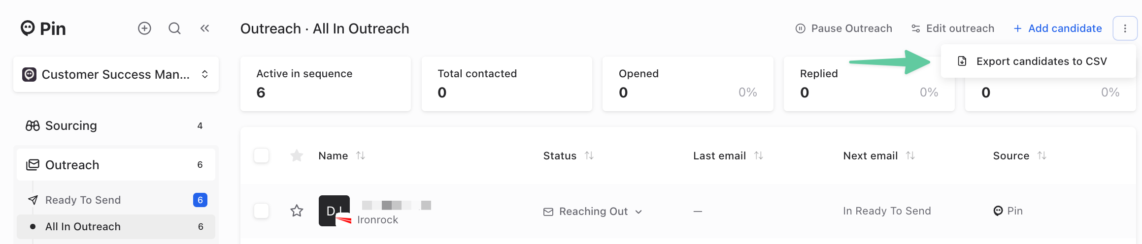 Candidates can also be exported from Pin through both the All Candidates dashboard and the "All in Outreach" tab within the Outreach dashboard.